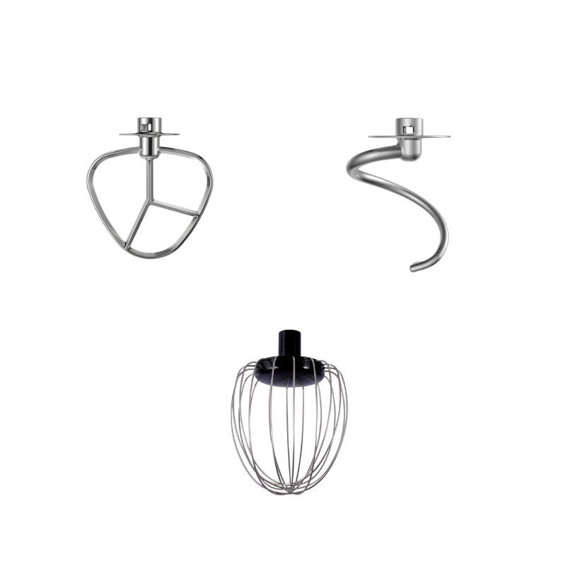 Accessoires inclus : crochet pétrisseur, fouet, batteur et spatule, tous détachables et faciles à nettoyer